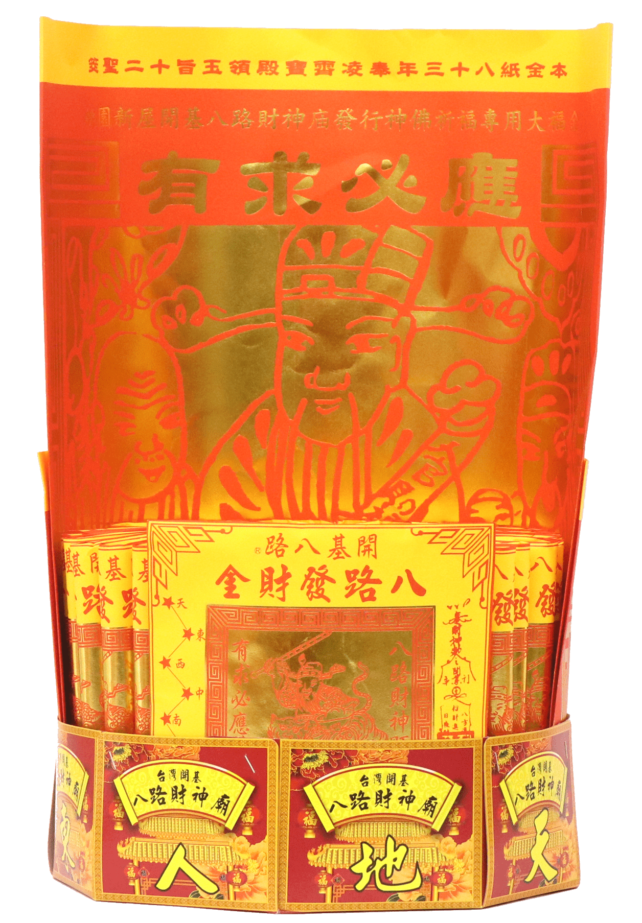 八路發財金是燒化給本廟開基天官八路財神爺-趙公明,用來祈求財利、補財庫專用金紙,一份金紙可求一種財利,補一個人的財庫,限一個人使用,夫妻可以共用。