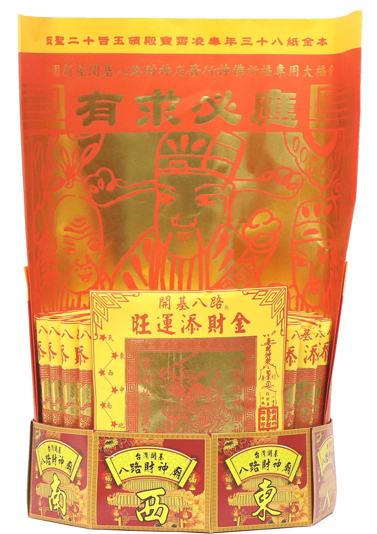 八路旺運添財金是燒化給八路武財神趙公明,用來祈求財利、補財運的金紙,一份金紙可求一種財利,補一個人的財運,限一個人使用,夫妻可以共用。